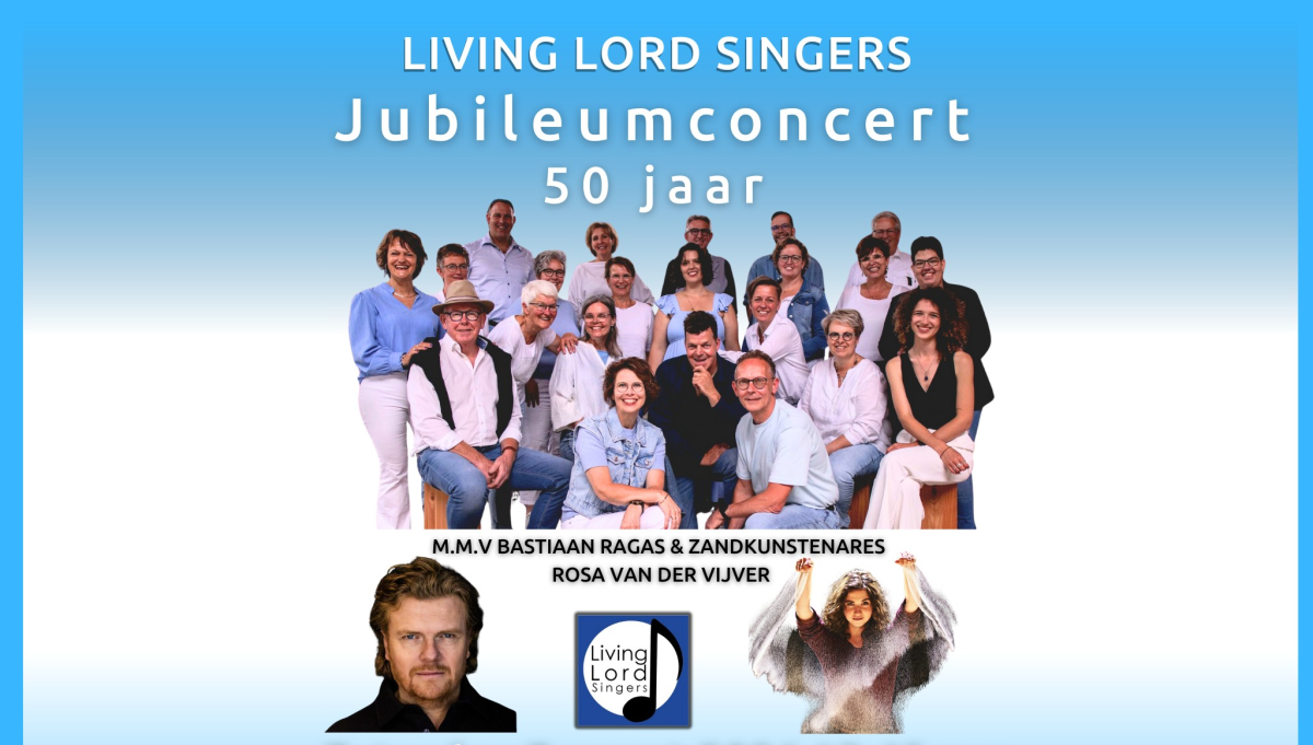 Gospelgroep Living Lord Singers viert dit jaar 50 jaar muziek en zang en nodigt u en uw gemeente graag uit voor een feestelijk jubileumconcert. Het koor wordt begeleid door dirigente Anne Verhart en een live combo. Bijzondere gasten zijn Bastiaan Ragas en zandkunstenares Rosa van der Vijver. Een avond vol muziek, inspiratie en beleving die u niet wil missen!